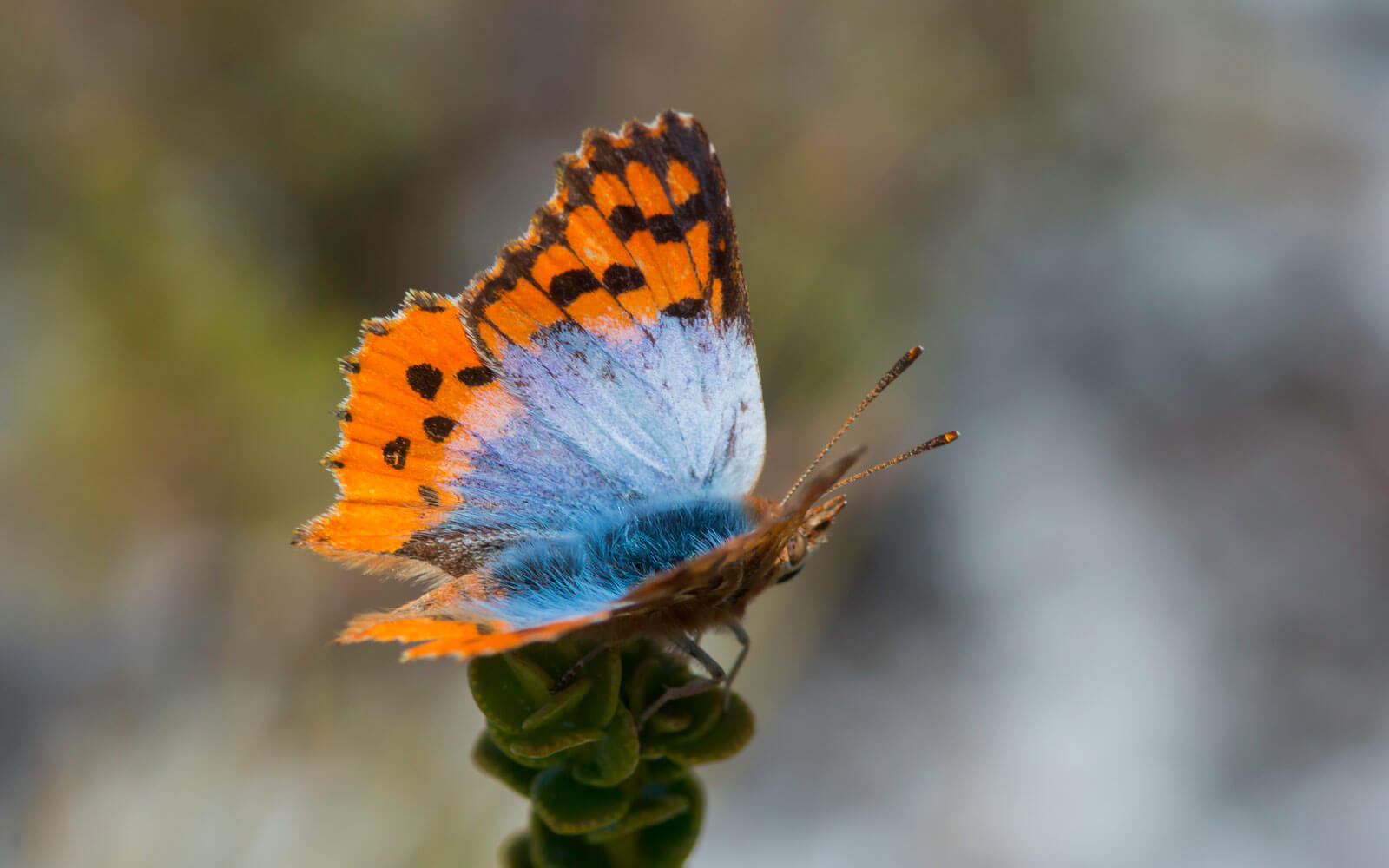 While the Natal Opal butterfly Chrysoritis natalensis frequently lays its eggs on O. moniliferum, both plant species also host the larvae of the Common Opal butterfly Chrysoritis thysbe. This butterfly shares its species name with Thysbe, who was one of the characters in the play within a play in Shakespeare’s A Midsummer Night’s Dream. The Common Opal, which also uses several other indigenous plants to feed its caterpillars, is found from the Cape Peninsula northwards to Hondeklipbaai and eastwards, about as far as Gqeberha (Port Elizabeth). It is a pretty little creature with copper wings that have blue bases.