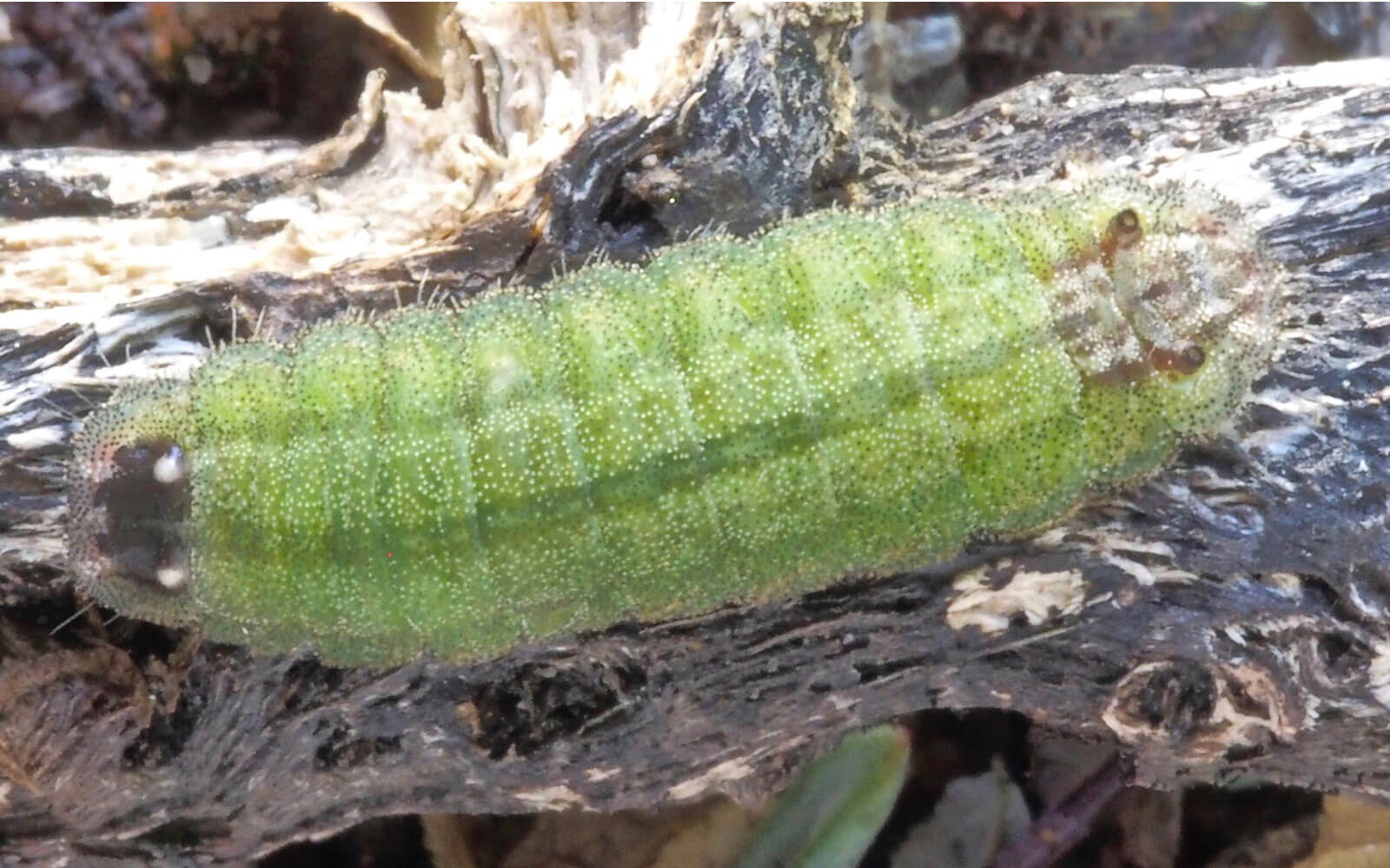 The larva (caterpillar) of the Common Opal butterfly Chrysoritis thysbe can vary in colour and may be brown or grey, and sometimes red at the tail end. This green one is most commonly seen.
