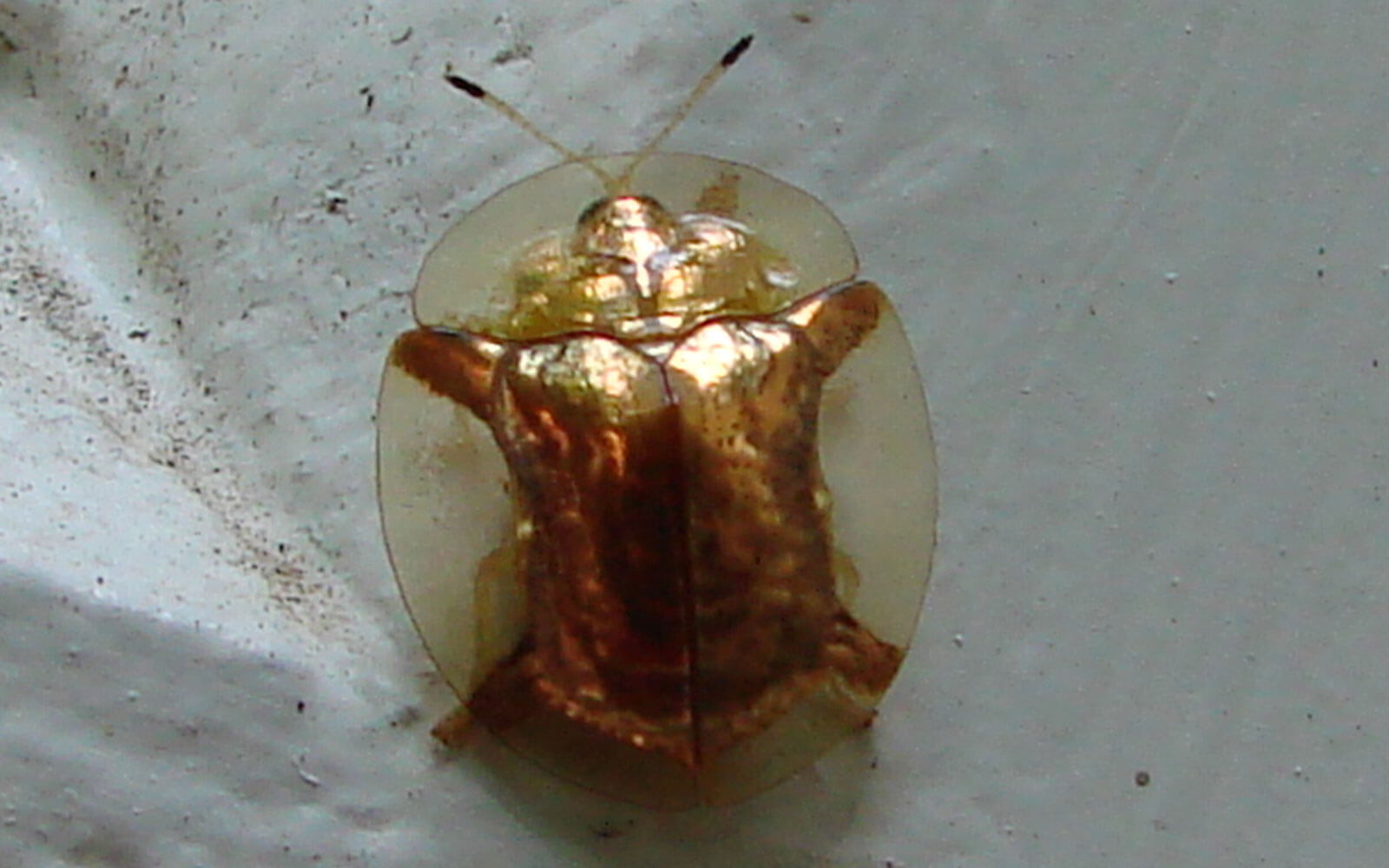 The beautiful Fool’s Gold Tortoise Beetle Aspidomorpha quadriremus is widely distributed in the south and eastern parts of the country and is sometimes seen in indigenous gardens where no insecticides are used.