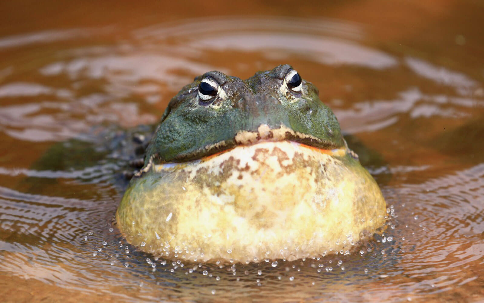 Giant Bullfrog (Pyxicephalus adspersus) note the communication ripples n the water.