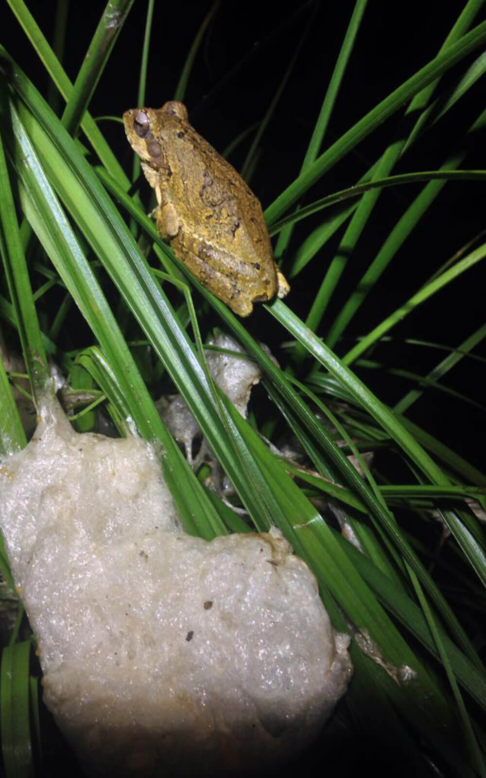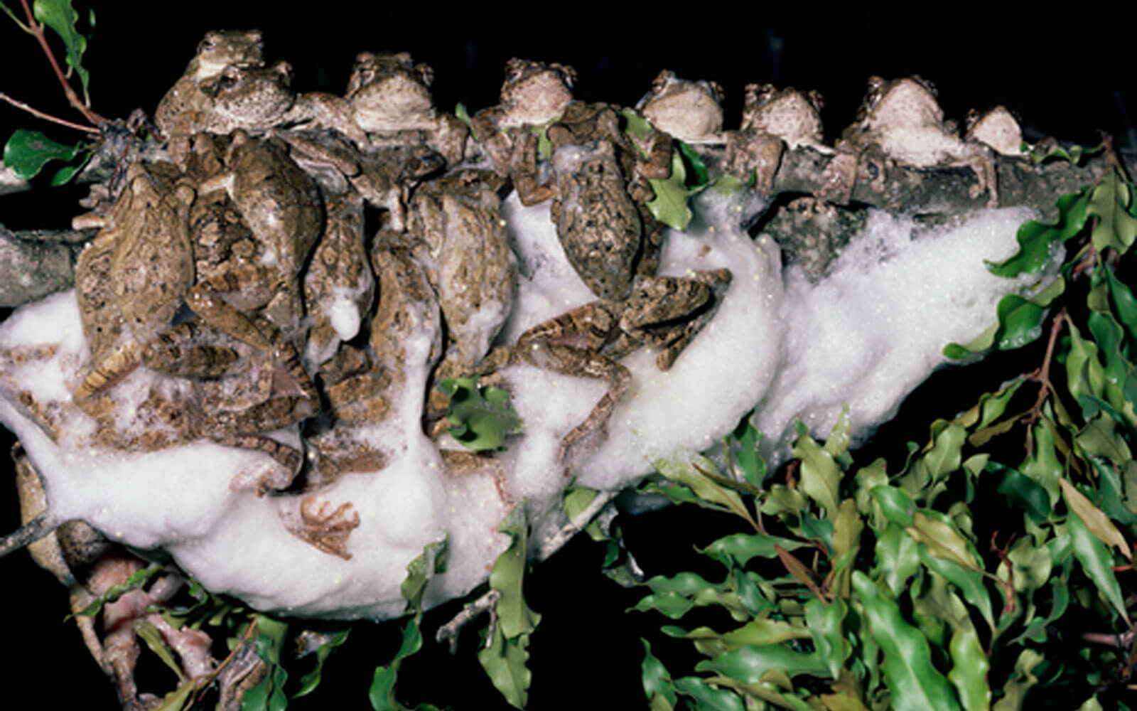 During the breeding season, males gather at suitable nesting sites at night where they produce soft, discordant croaks and squeaks. They do not appear to be territorial, and two or more frogs close together, or even on top of each other. The female leaves the water and climbs up to the nesting site where amplexus with one of the males takes place. Nest construction begins when the female releases a fluid from her cloaca, which both the female and males churn into a dense white foam with their legs. Peripheral males take up positions on either side of the amplectant pair and attempt to position their cloacae adjacent to that of the female during bouts of oviposition. Thus, the female’s eggs may be fertilised by more than one male. The nest may take up to seven hours to complete, and nest construction is split into 2–4 sessions. Between sessions, the female leaves the nest site and returns to the water to rehydrate. At this time, the amplexing male may dismount and, on returning to the nest, the female may amplex with a different male (Jennions et al. 1992). Communal nests, involving two or more females and numerous males, are commonly formed. One such nest contained 50 males and 20 females (Passmore and Carruthers 1995). The female usually returns the following night and adds a second layer of foam (not eggs) to the top of the nest. Males seldom attempt amplexus on the second night; if they do, they soon release the female and leave (M.D. Jennions pers. comm.). Jennions et al. (1992) recorded a mean clutch size of c.1200 eggs for single-female nests.